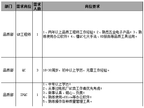 品質(zhì)部招聘